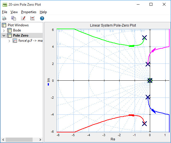 You can edit your controller as an ABCD State Space system, a Transfer Function or in a Zero Pole Gain form. Changes in one of the subsystems directly update all open plots and dialogs. For instance, adapting the controller gain immediately changes poles and zeros of the closed-loop system and the overall step response. The integration within 20-sim and linear system exchange with MATLAB makes this editor a powerful tool for designing feedback control systems!