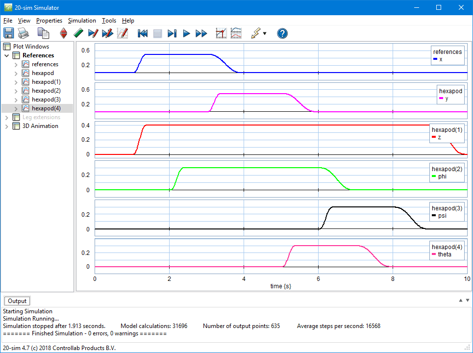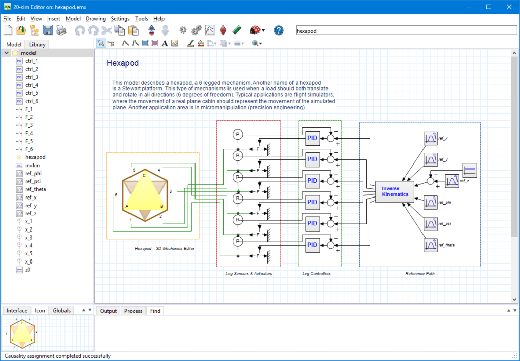 The image above shows 20-sim with a model of a controlled hexapod. The mechanism is generated with the 3D mechanics feature and connected with standard actuator and sensor models from the mechanics library. The hexapod is controlled by PID controllers which are tuned in the frequency domain. Everything that is required to build and simulate this model is inside the package. No external software or compiler is needed! This article gives a small introduction to 20-sim.