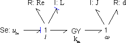 | 4. | Apply constraint causality. The 1 junction on the left has one bond with effort-out causality (seen from the 1 junction). The other bonds connected must therefore have effort-in causality (seen from the 1 junction). In a same way we can now assign causality for the GY-element: |